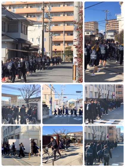 訓練は本日行ったのですが、1月9日に西淀川区内で強盗事件が発生し、犯人が刃物を持って逃亡した際にも実施しました。今年は今回が2回目となります。川北、出来島、大和田の22班に分かれて、集団下校ました。