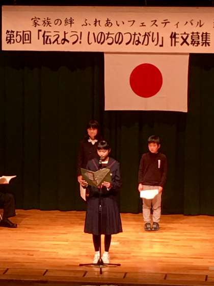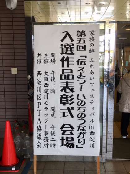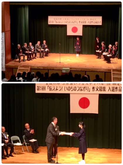 2月11日(日)エルモ西淀川大ホールで、第5回「伝えよう!いのちのつながり」作文募集入選作品表彰式が開催されました。本校からは、西淀川区PTA協議会賞に1-3 蔵本帆里さん、優秀賞に3-3中嶌希さん、高口智恵里さん、が表彰を受けました。