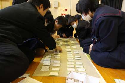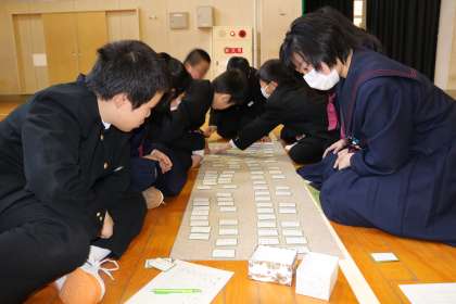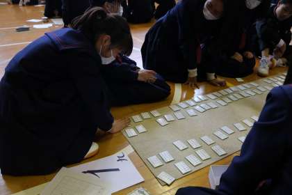 本日の3,4限目に体育館で百人一首大会を行いました。生徒たちは一生懸命に取り組んでいました。優勝は1年1組でした。もちろんどのクラスも優勝を同じぐらいの頑張りでした。