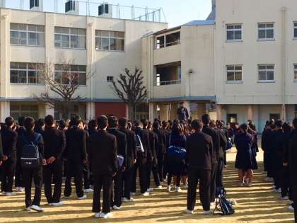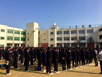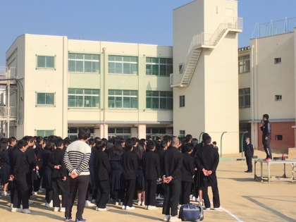 今年度、3学年揃っての全校集会です。久しぶりにグラウンドで青空の下全校集会を行いました。