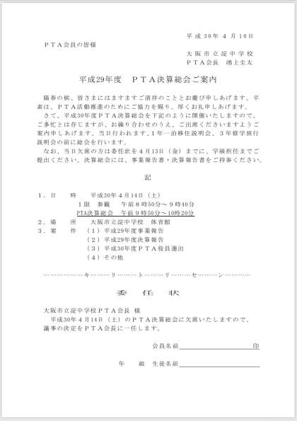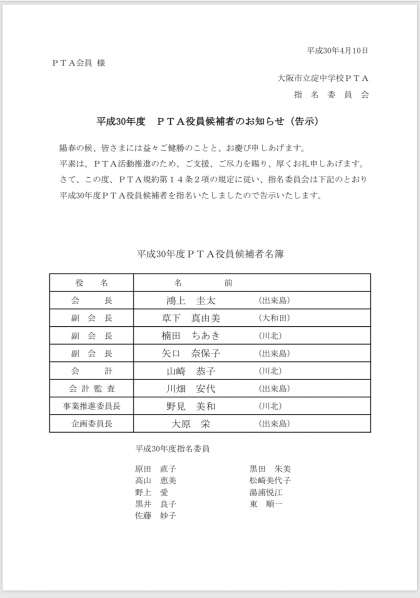 PTA決算総会・平成30年度PTA役員候補のお知らせ