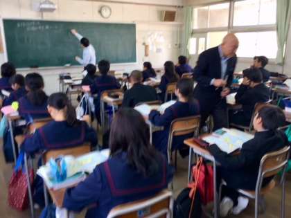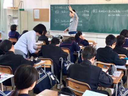 上の写真は数学、下の写真は社会の授業です。淀中学校では、習熟度別授業・少人数授業・ティームティーチング等、多様な学習を取り入れて指導しています。