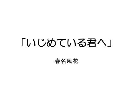 つづいて、2012年8月16日朝日新聞デジタルに掲載された春名風花さんのコラムをパワーポイントで紹介しました。コラムのタイトルは「いじめている君へ」です。次にリンクを貼ります。ご覧ください。