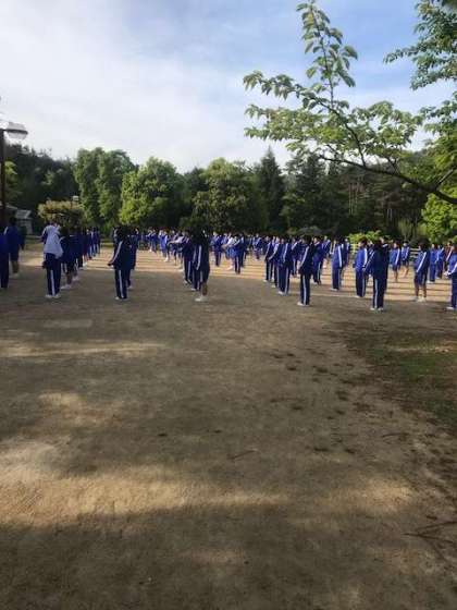 宿舎前で朝の集いです。