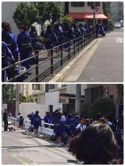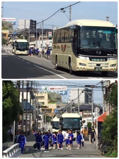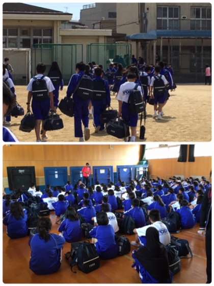 1年一泊移住のバスは学校に帰着しました。武道場に入り、最後の集会をしています。