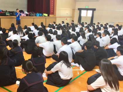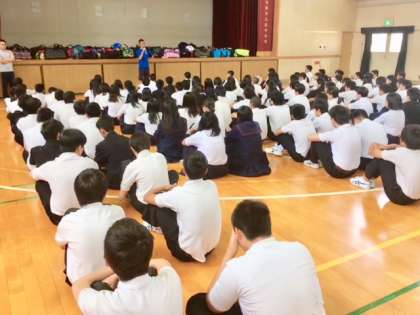 3年生は、4時間目体育館に集まり事前指導を受けています。生徒は明日の話を聞きながら期待に胸をふくらませています。