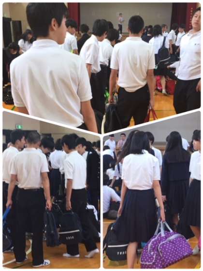 体育館に集まり、荷物の確認や座席の確認、注意事項を聞いています。