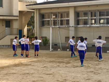 サッカー部は音楽に合わせて、楽しくウォーミングアップをしていました。私も踊り出しそうなくらい楽しく練習しています。