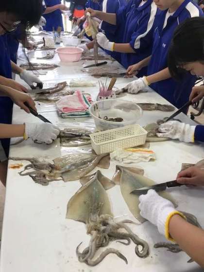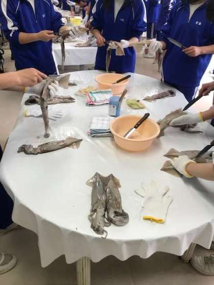 イカの一夜干し体験です。ときどき悲鳴が上がりながらもがんばっています。
