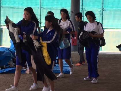 ウエットスーツに着替えて、講習を受けます。講習後はライフジャケットを着用して、浜辺に移動します。