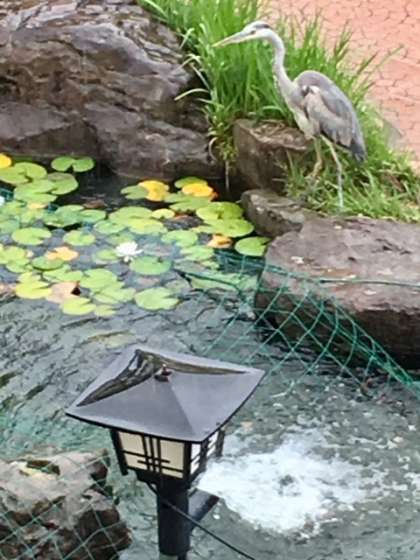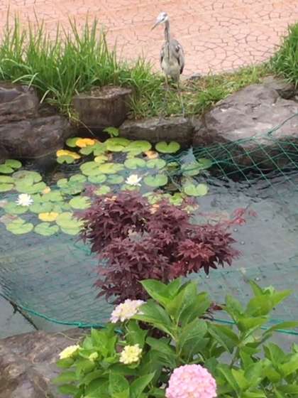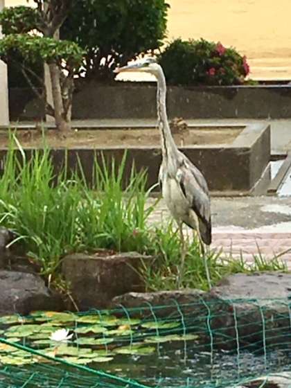 雨の朝です。今日も学校の池にはアオサギがやってきました。