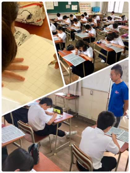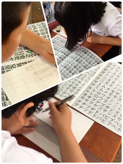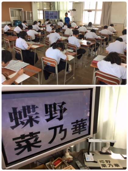 1年生美術の授業の様子です。実物投影機や大画面テレビで手本を参考にレタリングに取り組んでいます。
