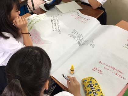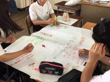 ワールドカフェの手法で、グループで意見を交わし課題解決に向けて主体的に学習しています。