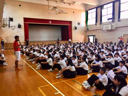 全校集会を行いました。校長先生からは春季総合体育大会で入賞した生徒へ賞状とメダルの伝達がありました。また、今週末の体育大会について、熱中症にならないよう十分に注意して、素晴らしい体育大会にしようと話されました。