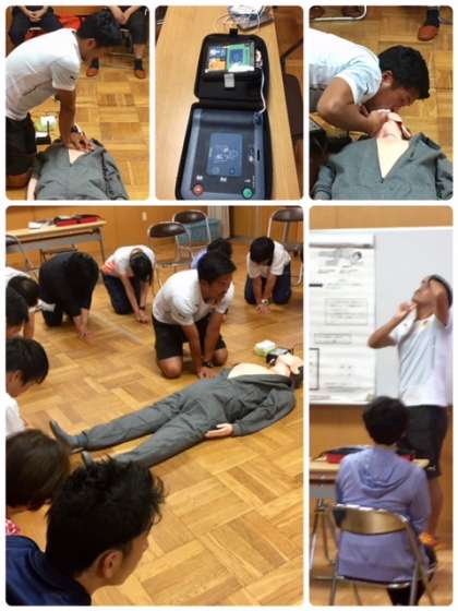 午後の時間を活用して、教職員救急救命研修を行っています。本来は消防署職員の方に講習をお願いしていましたが、先の大阪府北部を震源とする地震の影響を受けて、校内で研修を行いました。