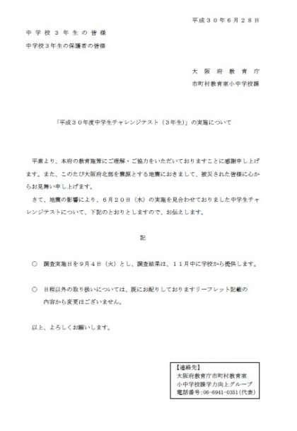 また、大阪府教育庁より「チャレンジテスト(3年)」の日程決定の通知がありました。生徒を通じてプリントを配付しております。ご確認ください。