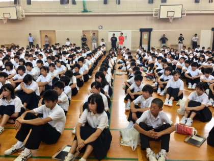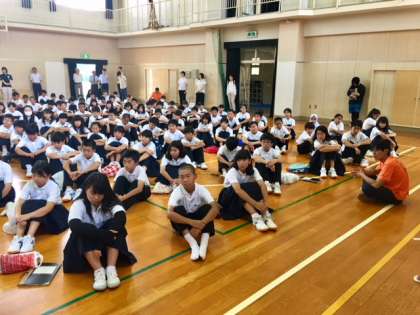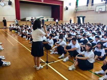 続いて、校長先生の話です。西日本豪雨の死者が200名を超えてしまいました。行方不明になっておられる方も含めて、約300人です。被災地では、現在も水道・電気・ガスなどライフラインも復旧していない地域もあります。暑さが厳しいと思いますが、このように登校できる事に感謝しましょう、水道や電気など節約しましょうと話がありました。