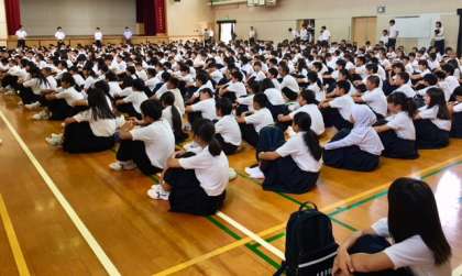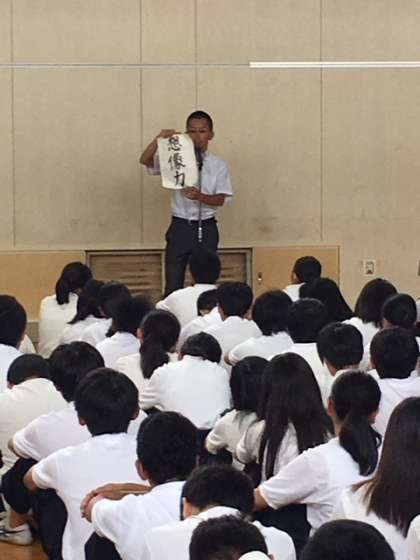 校長先生からは、「勉強でも、部活でも、趣味でも目標を立ててしっかりやり抜いてください。」「始業式では、ひと回り大きくなって、元気な顔を見せてください。」と話しました。また、2学期始業式の日には、校区の小学校と合同で防災訓練(集団下校)が予定されています。小学生と地域班、登・下校班に混じって訓練します。校訓の「奉仕」の精神で良きリーダーとなってください。さらに2学期からは、学校調理方式の給食が始まります。先週配付の手紙の通りしっかり準備をお願いします。