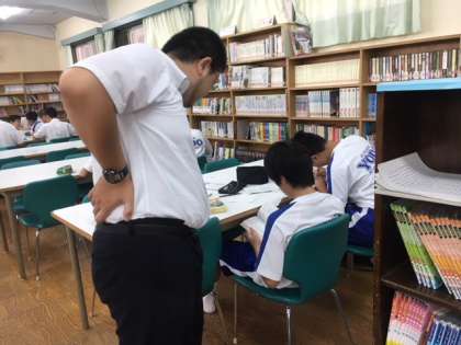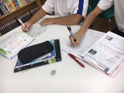 今日も朝から調べ物をする人が来ています。図書館にはたくさんの資料や参考書、新聞もあります。また、受験勉強している3年生もいます。涼しい図書館で勉強しませんか?