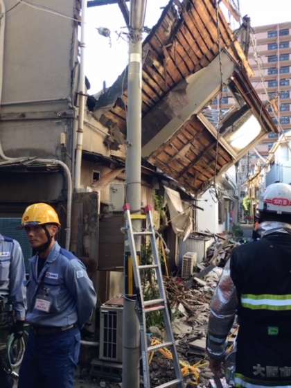本校、校区内・大和田三丁目の家屋が崩壊して危険です。西淀川消防署からは2階部分が崩壊して電線に引っかかっている状態です。電線が切れると、建物全体が倒壊する恐れがありますので、決して近寄らないようにしてください。