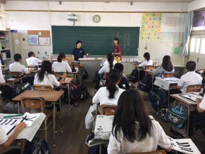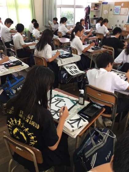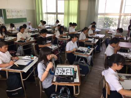 1年生の国語の授業です。毛筆書写を学んでいます。教室の中は墨・墨汁の匂いが心を落ち着けます。