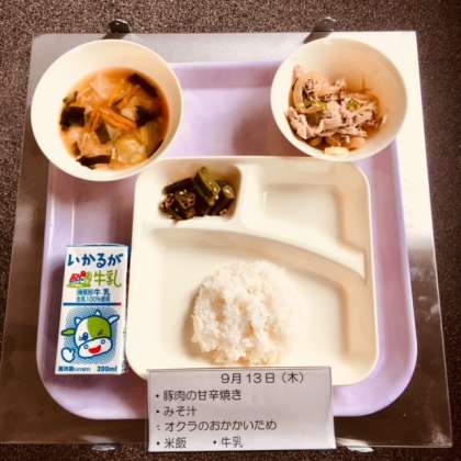 今日の献立は、豚肉の甘辛焼き、オクラのおかか炒め、味噌汁、米飯、牛乳です。