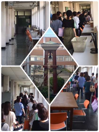 学校概要に続いて、校舎内を案内してくださいました。中庭には自彊の鐘があります。廊下や教科準備室の前には、互いに教え合い学び合うアクティブラーニングスペースがあります。自ら学び合う姿勢を育てておられる様子が良くわかりました。