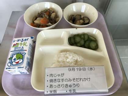 今日の献立は、肉じゃが、焼きなすのみそだれかけ、あっさりきゅうり、米飯、牛乳です。