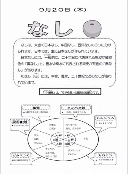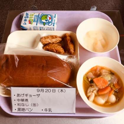 今日の献立は、揚げ餃子、中華煮、和梨(缶)、黒糖パン、牛乳です。
