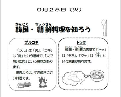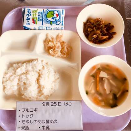 本日の献立は、韓国・朝鮮料理の登場です。プルコギ、トック、もやしの甘酢和、ご飯、牛乳です。