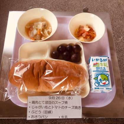本日の献立は、豚肉とてぼ豆のスープ煮、じゃがいもとトマトのチーズ巻、ぶどう(巨峰)、おさつバン、牛乳です。