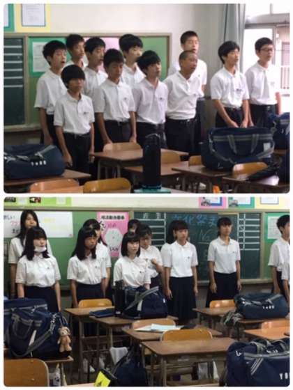 雨がやっとあがり、少し肌寒い朝です。朝、出勤時に淀中学校から、歌声が聞こえて来ました。まだ8時前ですが、どこから聞こえて来るのかと耳を澄ませると2年1組でした。校舎の階段を駆け上ると、担任の前田先生と子ども達が明日の文化祭に向けて合唱練習をしていました。眠い目をこすりながら、集まってくる子どもたちは立派ですね。クラスの絆を結び思い出となること間違いありません。頑張れ!2年生!