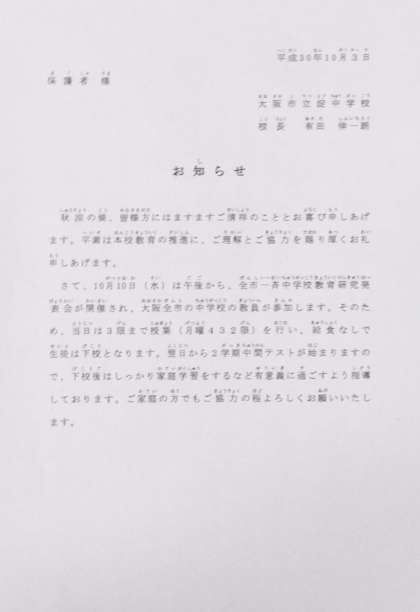 10月10日(水)は、大阪市立中学校の教員研修のため3時間目終了後下校といたします。