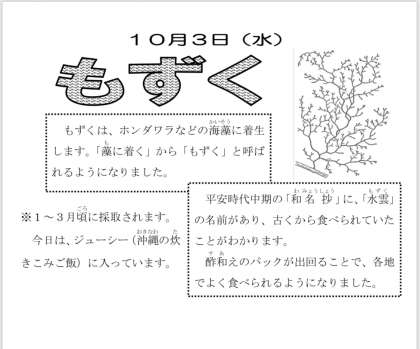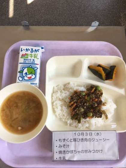 本日の献立は、もずくと豚ひき肉のジューシー、味噌汁、焼きかぼちゃの甘蜜掛け、牛乳です。
