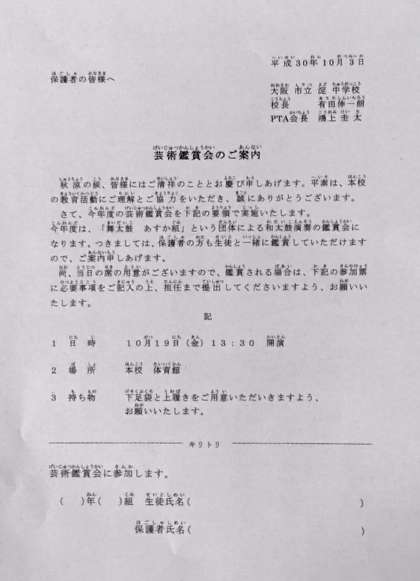 席の都合上、申し込み用紙を担任の先生まで、ご提出ください。