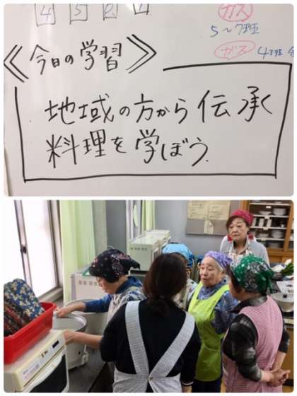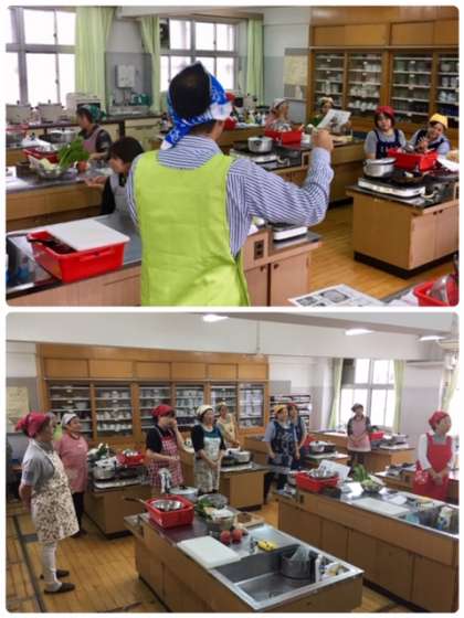 今日も、地域の皆様、保護者ボランティアの皆様にお越しいただいています。1年生で実施している「伝承料理」調理実習です。