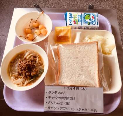 本日の献立は、タンタン麺、キャベツの甘酢づけ、さくらんぼ(缶)、食パン、アプリコットジャム、牛乳です。