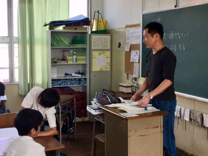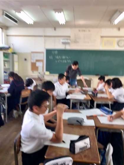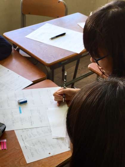 数学の授業です。中間テストを振り返ってグループで学び合いをしています。数学が得意な生徒が少し苦手な生徒に丁寧に教え合っていました。