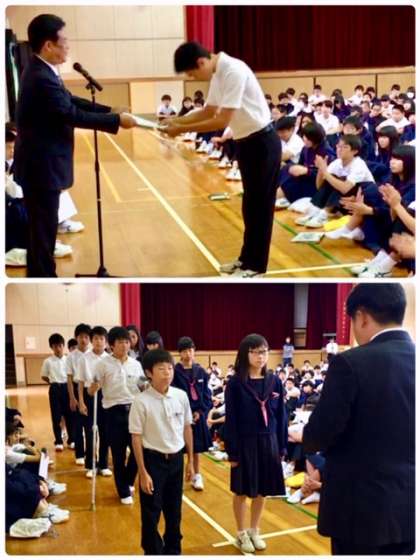 続いて、後期学級生徒会役員の認証状を渡しました。代表して2年1組の各委員に受け取ってもらいました。学級のために、自身のためによろしくお願いします。