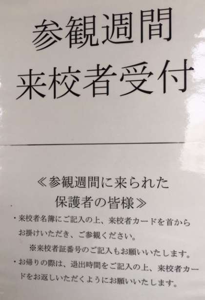 参観希望の方は、インターフォンを鳴らして入校ください。正門を入ってすぐ右手の校舎2階に職員室があります。
