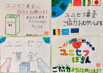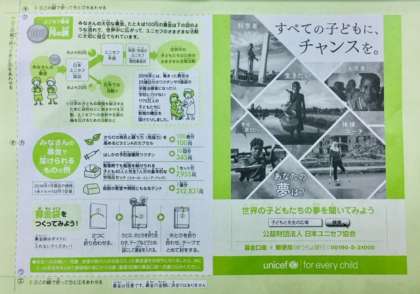 生徒会役員さんが、正門・通用門で募金活動を行います。この緑の紙を折りたたんで、のり付けして袋を作ってください。この袋で募金をお願いします。
