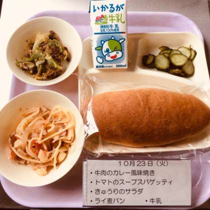 本日の献立は、牛肉のカレー風味焼き、トマトのスープスパゲッティ、きゅうりのサラダ、ライ麦パン、牛肉です。