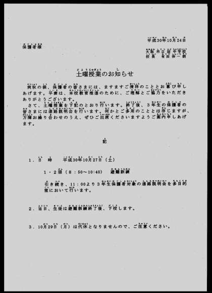 今週の土曜日(10/27)は土曜授業です。今回は土曜参加ではなく、防災訓練(避難訓練)を行います。