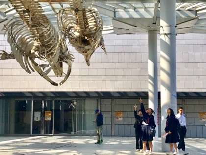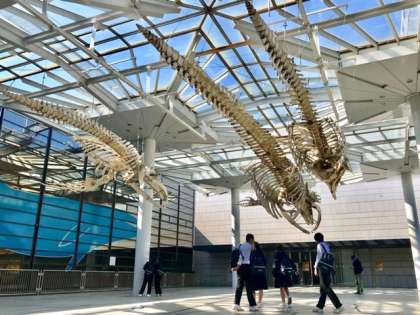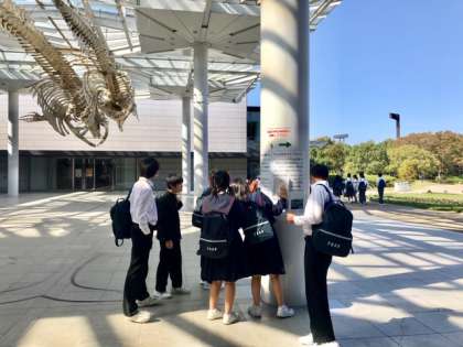 自然史博物館の様子です。クジラの骨格標本が屋外に展示されています。あらためて見てみると「めっちゃデカイ!」と中学生も驚きです。