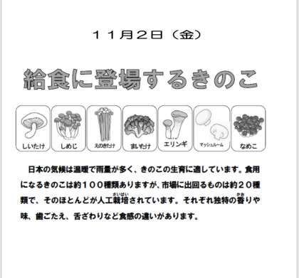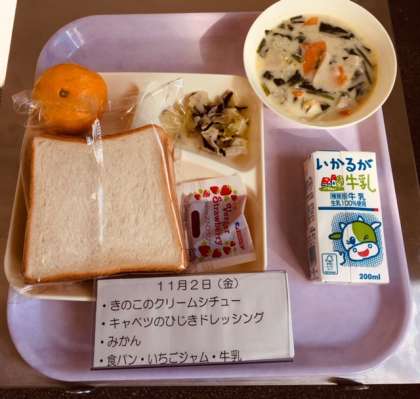 本日の給食は、きのこのクリームシチュー、キャベツのひじきドレッシング、みかん、食パン、いちごジャム、牛乳です。いただきます!