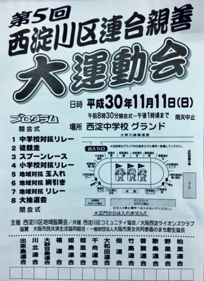 今週の日曜日(11月11日)に、西淀中学校グラウンドで「第5回 西淀川区連合親善大運動会」が開催されます。