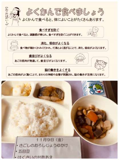 今日の給食メニューは、さごしのおろしじょうゆかけ、五目豆、はくはいの甘酢あえ、米飯、牛乳です。