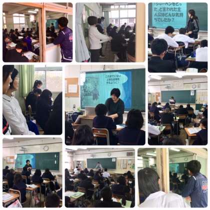 毎週、火曜日の1時間目は道徳の授業です。淀中学校では、学習指導要領改訂で来年度から実施される特別な教科「道徳」の研究授業を行っています。今月は1年生担当の先生が研究授業をして授業の公開をしています。教員は互いの授業を相互に参観し、授業の改善に取り組んでいます。