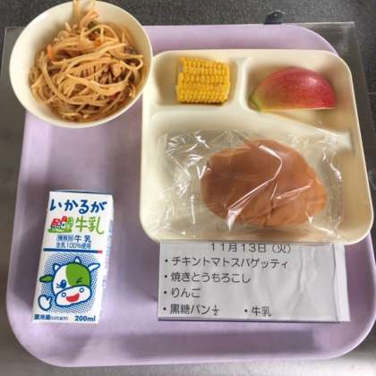 本日の献立は、チキントマトスパゲティ、焼きトウモロコシ、りんご、黒糖パン1/2、牛乳です。