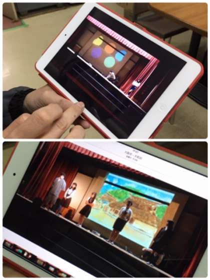 6年生担任の宮浦先生から、淀中学校英語部に応援要請がありました。iPadで6年生の劇の練習を英語部員が見せていただきました。